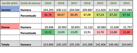 Una delle attività lavorative maggiormente caratterizzata da una squilibrata composizione di genere è sicuramente la fattispecie degli agenti di commercio che è, ed è sempre stata, prettamente maschile. L’ultimo bilancio sociale della Fondazione Enasarco – ente di previdenza della categoria – evidenzia come i propri iscritti attivi siano costituiti per il 13,22% da donne e per il restante 86,78% da uomini. Un dato che è rimasto pressoché invariato nel periodo di tempo intercorrente tra il 2013 ed il 2019, come da tabella seguente.