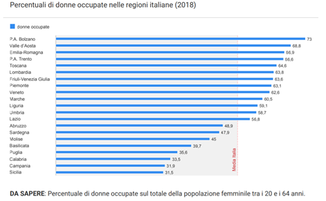 Per quanto riguarda la disposizione geografica, la disparità di genere si pone con maggiore rilevanza nelle regioni del centro-sud. Ad evidenziare questa problematica, dal punto di vista lavorativo, è uno studio a cura dell’Associazione Openpolis rubricato “Occupazione 2020”, focalizzato sulla percentuale di donne occupate nelle regioni italiane.