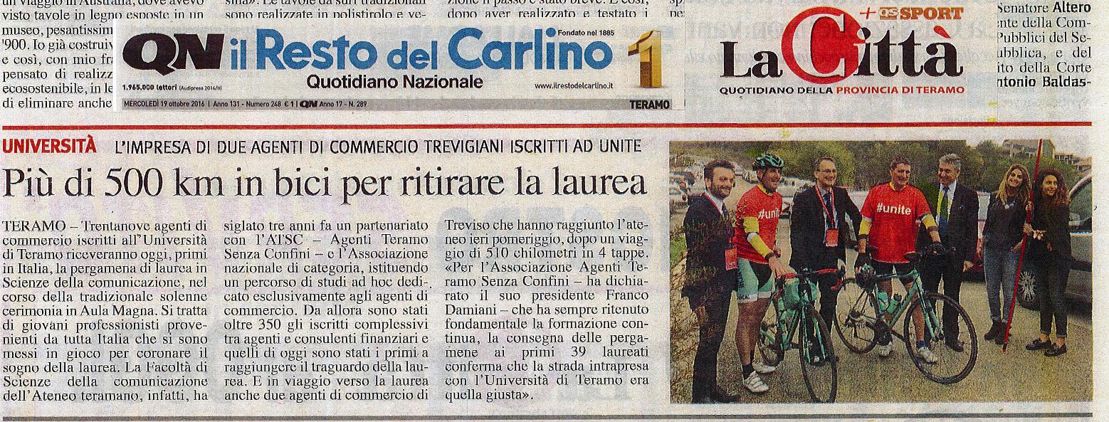 Da allora sono stati oltre 350 gli iscritti complessivi tra agenti e consulenti finanziari e quelli di oggi sono stati i primi a raggiungere il traguardo della laurea. E in viaggio verso la laurea anche due agenti di commercio Treviso che hanno raggiunto l’ateneo ieri pomeriggio, dopo un viaggio di 510 chilometri in 4 tappe.